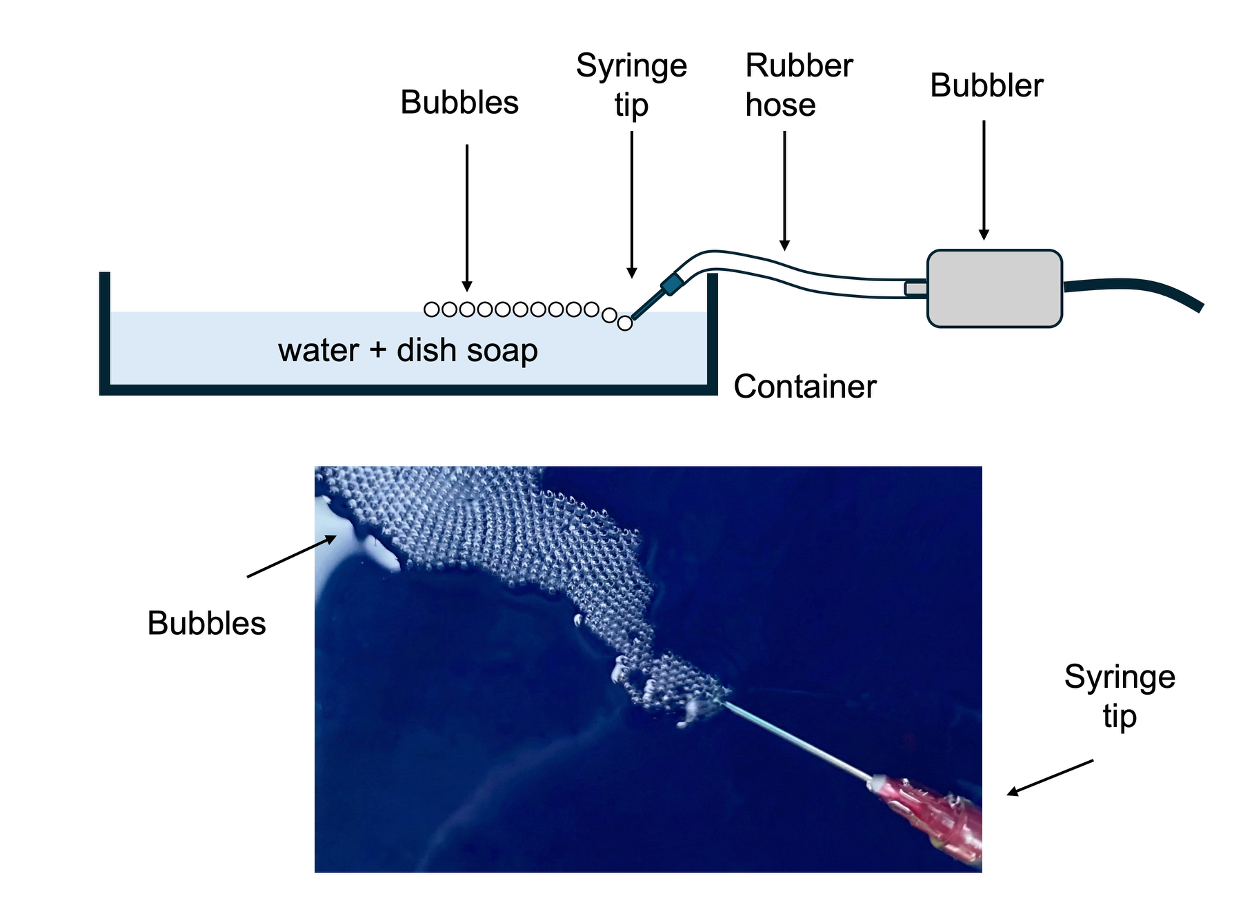 Third, turn on the bubbler and place the syringe needle into the soapy water. You should quickly see uniformly sized bubbles forming. If the bubbles rise too quickly and begin to pile up, gently blow them aside with your breath (or use a hair dryer on a low setting or portable fan). Soon, you’ll observe the bubbles attaching to one another and arranging themselves into a periodic pattern. This attraction occurs because of surface tension, which pulls bubbles together—much like how atoms bond due to chemical forces.